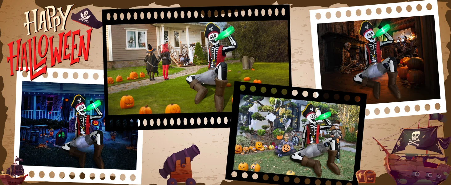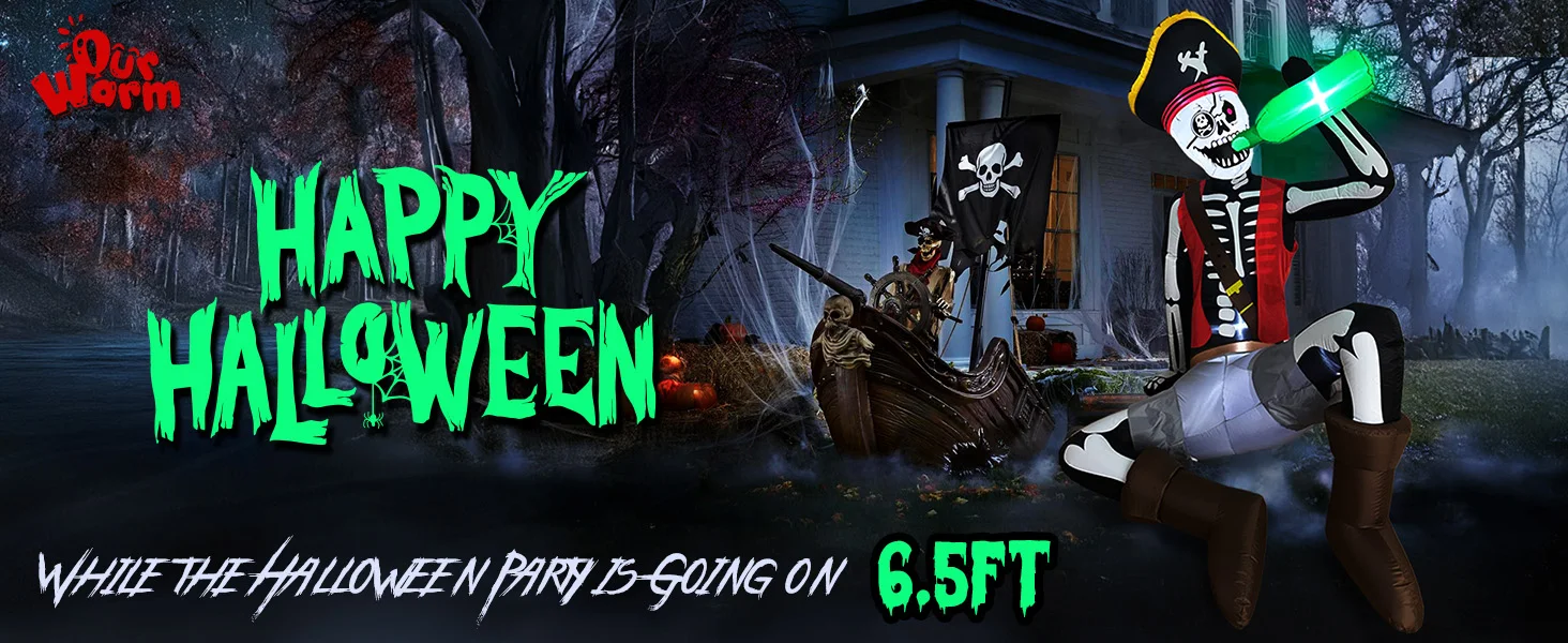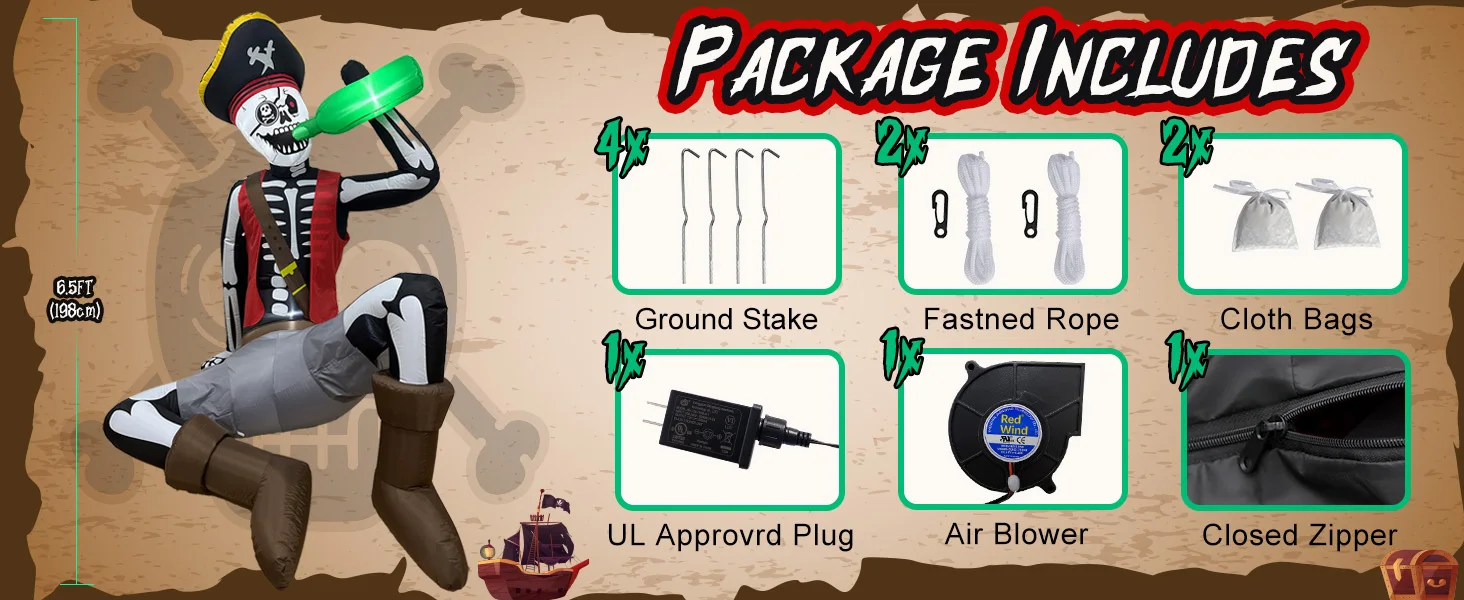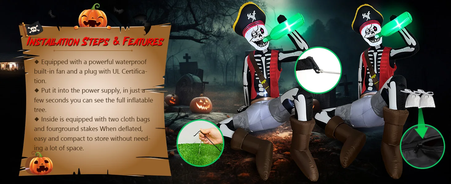 【Eye-Catching Skeleton Halloween Inflatable Decor】Transform your outdoor space into a spooky spectacle with CYAOOI 6.5 FT inflatable Halloween decor outdoor. This larger-than-life inflatable pirate skeleton drinking amidst an eerie ambiance is sure to capture the attention of passersby and become the focal point of your outdoor Halloween decorations.