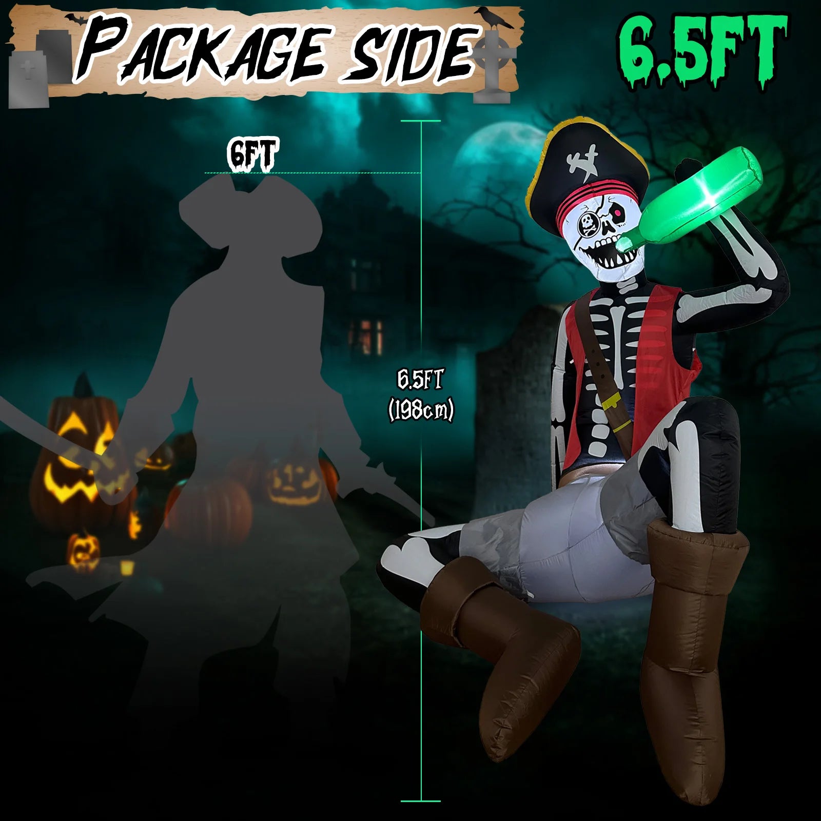 6.5 FT Halloween Inflatables Skeleton Decorations, Scary Inflatable Pirate Skeleton Sitting and Drinking with LED Lights, Blow Up Halloween Yard Decorations for Garden Lawn Patio Party Supplies